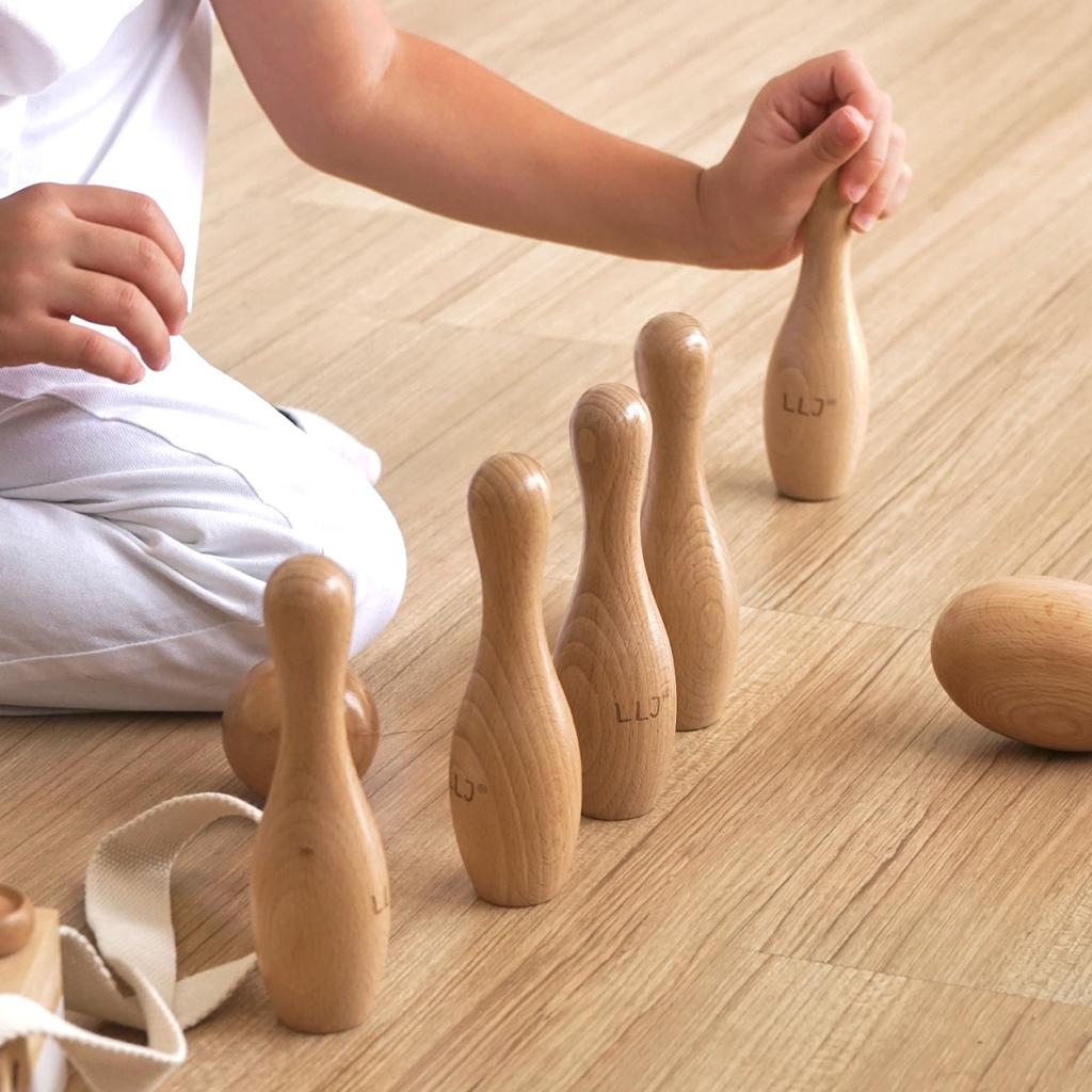 Set the wooden pins up on any flat surfaces and have your little one sit down and bowl the pins over by rolling away from the wooden balls.